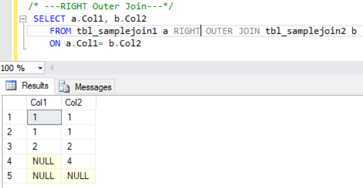 c) Right Outer Join: As we have added one extra record of NULL value in the 2nd table tbl_samplejoin2 and there is no matching value of NULL in the 1st table. So we have the 5th row with one NULL value from the right table tbl_samplejoin2 and another NULL from the left table as there is no matching record of NULL value in the left table.