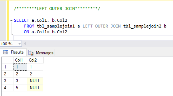 b) Left Outer Join: If look at both tables' data, we found that two records (1 & 2) of the table tbl_samplejoin1 have the matching records in the second table tbl_samplejoin2. But the remaining two records (3 & 5) don’t have the matching record in the second table. So result-set returns records 1 & 2 of table tbl_samplejoin1 with matching records 1 & 2 from right table and for records 3 & 5, it return with NULL value.