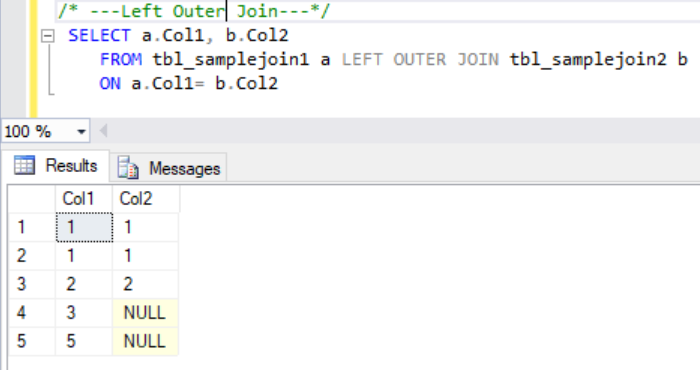 b) Left Outer Join: If we look at both tables' data, we will find that two records (1 & 2) of the table tbl_samplejoin1 have the matching records in the second table tbl_samplejoin2. But the remaining two records (3 & 5) don’t have the matching record in the second table. So result-set returns values of 1 & 2 from table tbl_samplejoin1 with matching values 1 & 2 from second table and for records 3 & 5, it return with NULL value.